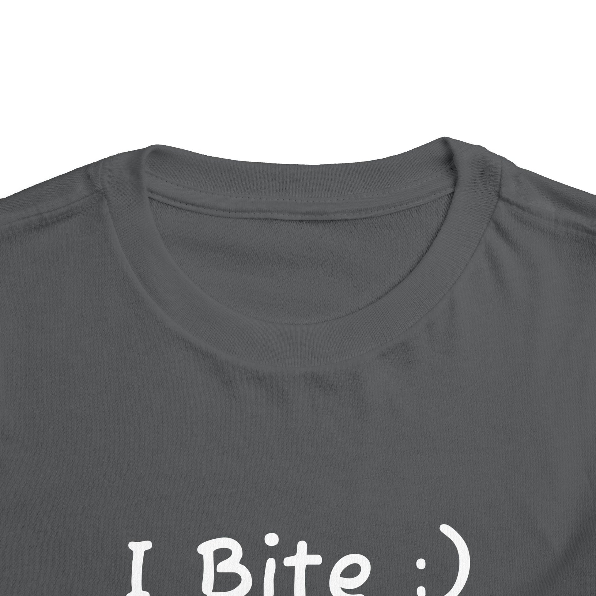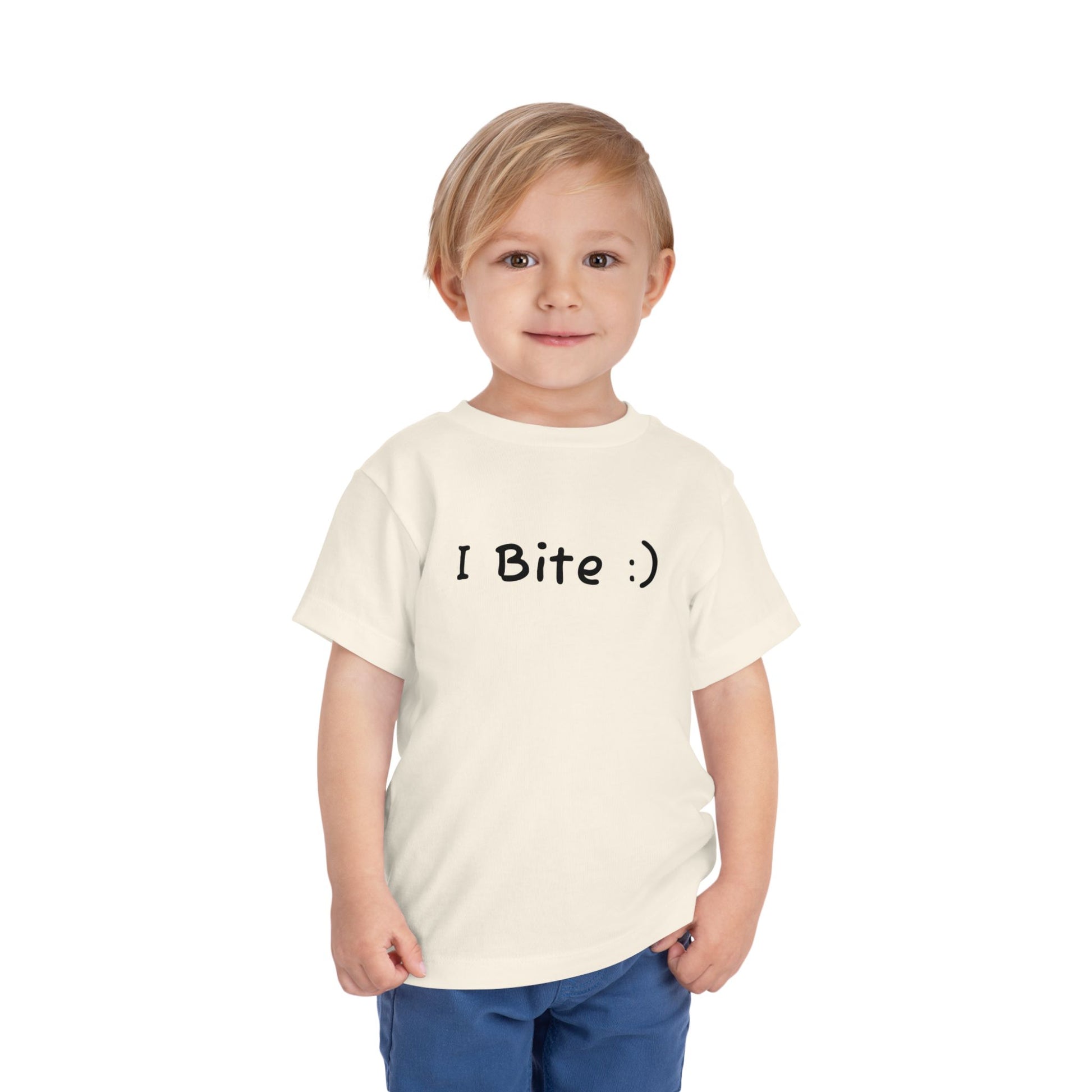 Let your little one show off their personality in this adorable toddler tee! Featuring a playful "I Bite :)" design, it's the perfect way to add some cheeky charm to their wardrobe. The relaxed fit ensures all-day comfort for active toddlers, while the soft fabric keeps them cozy. Available in multiple colors to match any style, this tee is a fun staple that parents and kids will love.